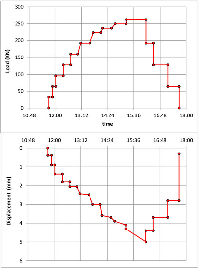 Four lateral load tests on 609 mm diameter, 12 mm thick, metallic tubular piles have been carried out. The piles were driven to a depth of 23 m. The load was applied at the top of the pile, up to 260 KN, on 10 steps. Each step was 32.5 KN and it was kept by 30 min before to apply the next step. A representative graph of these tests is shown in the following Figure 4.