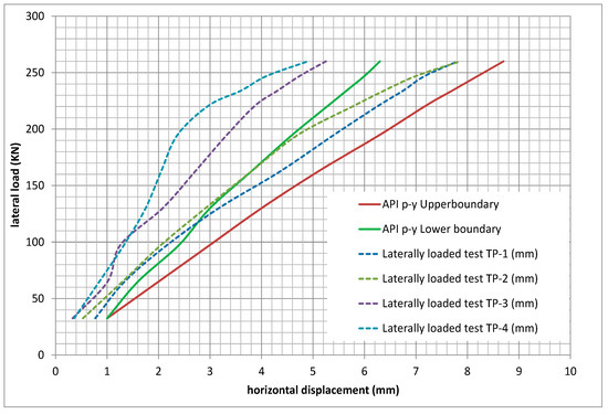 The following figure compares the results of the pile load test with the analytical model. It is observed how pile tests TP-1 and TP-2 fall within the boundaries defined between the upper and lower limits of p-y model.