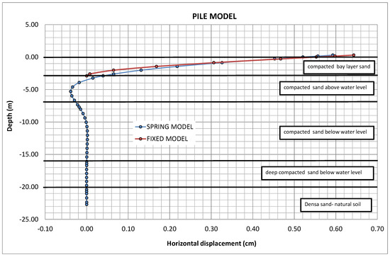 The entire deformation of the pile with depth is shown in the Figure 9 below. Blue line shows the deformation obtained with the spring model. The chart also shows the equivalent cantilever beam which has the same deformation at the pile top, but it is fixed at a certain depth.