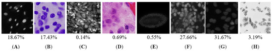 A diverse set of images and their proportions in the set: (A,B) Typical cases with a clear view; (C,D) rare instances surrounded by histological structures; (E) heavily clustered nuclei; (F) blurriness and a high level of overlapping; (G) an extremely high level of blurriness; and (H) an extremely high level of overlapping.