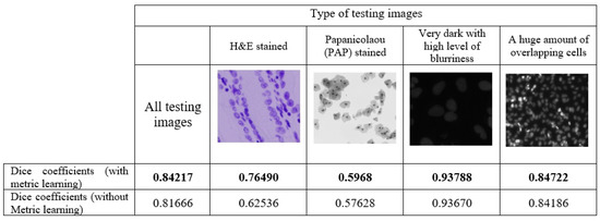 From the Figure 2, it is apparent that a 3.12% increase in the average value of Dice similarity coefficients with deep metric learning was achieved as compared to no metric learning. The largest gain of 22.31% is observed for the H&E-stained images, which is an appealing result since many authors found H&E-stained images challenging in terms of segmentation. Comparatively, a slight increase of 3.56% in the average value of Dice similarity coefficients is also seen for the PAP -stained images, while no significant improvement is observed for the other types of images included in the testing set. On the other hand, for dark images with a high level of blurriness or images with many overlapping cells, which seemed to us to be challenging for automated nuclei segmentation, the value of Dice coefficients achieved by the deep convolutional neural network is comparatively high, and metric embeddings had no significant effect on model performance. Figure 3 reports the difference in Dice coefficients for different types of images in the testing dataset, which was computed for every image individually.
