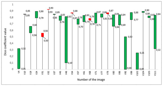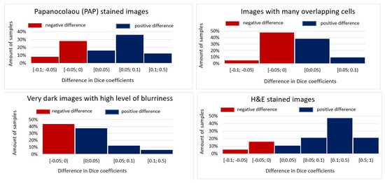 In Figure 3, the positive differences indicate an improvement in prediction performance when deep learning with metrics was chosen, while the negative values show worsened performances. It can be seen that metric embeddings in the deep network model resulted in a similar amount of negative and positive Dice coefficients when images with many overlapping cells or very dark images with a high level of blurriness were under consideration (see Figure 3). This is in line with the average values of Dice coefficients reported in Figure 2, where the overall improvement was nearly zero, i.e., 0.624% for images with many overlapping cells and 0.126% for dark images with a high level of blurriness. Notably, for the latter case, the improvement is slightly larger since we can observe more cases when the difference is larger than . A very similar situation can be observed for PAP-stained images. In fact, the most significant improvement is observed for H&E-stained images, where the Dice coefficients are in the range for a major part of testing images. For this reason, we performed an in-depth analysis focusing solely on individual H&E-stained images in the testing set (see Figure 4). The figure plots the differences in Dice similarity coefficients achieved by the deep network model with metric learning (triplet loss semi-hard mining) and without metric learning.