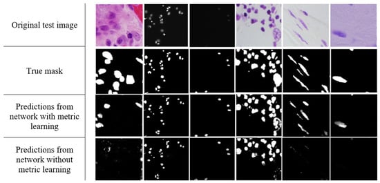 As one can see in Figure 4, the difference ranges from −0.06 to 0.72. Overall, these results suggest that metric embeddings used in deep learning enhance cell nuclei segmentation applied to H&E-stained images. For demonstration purposes, Figure 5 depicts how the predictions differ when deep metric learning is used compared to when no metrics are embedded.