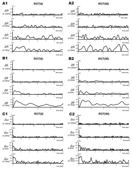 Typical examples of circular tracking movements for 0.125 Hz, 0.25 Hz, 0.5 Hz, and 0.75 Hz. (A1) Absolute values of ΔR for the frontal plane (ROT(0)) and (A2) the sagittal plane (ROT(90)). (B1) Absolute values of Δθ for ROT(0) and (B2) ROT(90). (C1) Absolute values of Δω for ROT(0) and (C2) ROT(90).