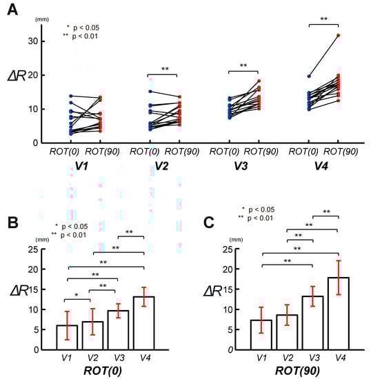 Evaluation of the circular tracking movement based on ΔR in 3D VR space. (A) The graphs indicate the pairwise comparison of ΔR analyzing the speed factor between ROT(0) and ROT(90). (B) The result of the pairwise comparison was indicated for ΔR, on the frontal plane (ROT(0)), at four target speeds. (C) The pairwise comparison was displayed for ΔR, on the sagittal plane (ROT(90)), at four target speeds.