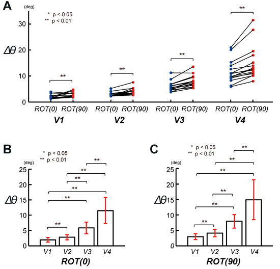 Evaluation of the circular tracking movement based on Δθ in 3D VR space. (A) The graphs indicate the pairwise comparison of Δθ analyzing the speed factor between ROT(0) and ROT(90). (B) The result of the pairwise comparison was indicated for Δθ, on the frontal plane (ROT(0)), at four target speeds. (C) The pairwise comparison was displayed for Δθ, on the sagittal plane (ROT(90)), at four target speeds.