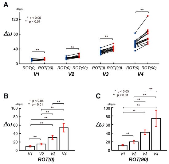 Evaluation of the circular tracking movement based on Δω in 3D VR space. (A) The graphs indicate the pairwise comparison of Δω analyzing the speed factor between ROT(0) and ROT(90). (B) The pairwise comparison was performed for Δω, on the frontal plane (ROT(0)), at four target speeds. (C) The pairwise comparison was performed for Δω, on the sagittal plane (ROT(90)) at four target speeds.