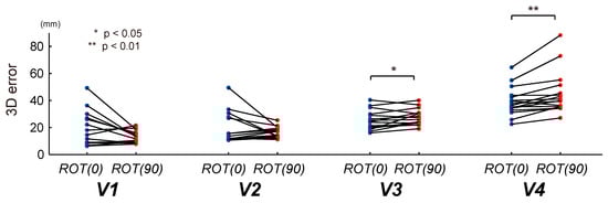 Evaluation of the circular tracking performance based on Δ3D (3D error; spatial errors in Cartesian coordinates). Note that, there was a statistically significant Δ3D difference under V3 and V4 conditions between ROT(0) and ROT(90).