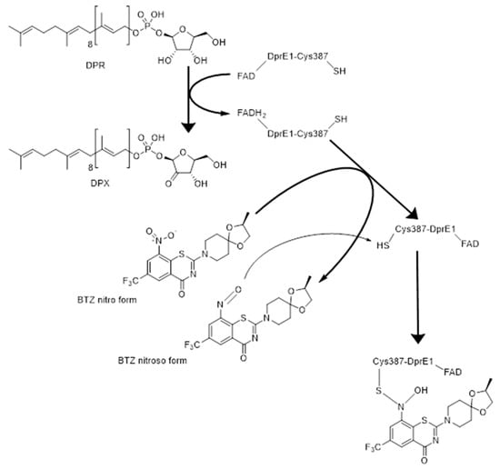 As above reported, all these compounds possess a nitro group, that is converted to nitroso through the oxidation of the FADH2 cofactor of DprE1, allowing the formation of a covalent bond with a cysteine residue. However, an alternative and similarly probable mechanism of formation of the nitroso group has been proposed. In this model, the thiol group of the cysteine is able to start the redox reaction which converts the nitro group into nitroso similarly to the von Richter reaction [].