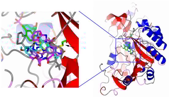 Crystal structure of Mycobacterium tuberculosis (Mtb) DprE1 and detail of the inhibitor binding sites. The superimposition of the structures of DprE1, cocrystallized with both covalent and noncovalent inhibitors (PBTZ-169, PDB: 4NCR [] with carbon atoms in grey; Ty38c, PDB: 4P8K [] with carbon atoms in cyan; TCA1, PDB: 4KWS [] with carbon atoms in magenta; CT325, PDB: 4FF6 [] with carbon atoms in violet), shows how the compounds have significantly overlapping binding sites, located in front of the isoalloxazine ring of the FAD cofactor (with carbon atoms in green). The black arrow points to the Cys387 side chain.