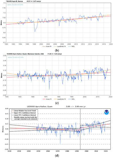 Figure 1c,d shows the MSL of Guam. The effect of two earthquakes is clear—one in the early 1990s, the other, which was much larger, at the end of the 1990s. However, NOAA placed a breakpoint about the first earthquake, the one with minor effects, and forgot the second one. By considering the short record starting from the time of the first earthquake, and ignoring the effect of the second earthquake, NOAA claim for Guam prior to the first earthquake a −1.05 mm/yr sea level rate of rise, and post the first earthquake a +8.58 mm/yr. [16]. This is also almost +9 mm/yr. The sea level rate of rise has been used as proof the sea levels are accelerating. Accounting for the effect of both earthquakes, the sea levels of Guam are also stable, as shown in [17].