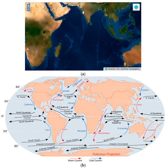 (a) Satellite image of the ocean basin under study. Image reproduced and modified from www.psmsl.org/products/trends/. Warm and cold major currents for the area. (b) Image reproduced and modified from https://en.wikipedia.org/wiki/Ocean_current#/media/File:Corrientes-oceanicas.png.