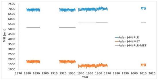 The tide gauge record of Aden was analyzed in [21]. Figure 4 presents the RLR (revised local reference) and MET (metric) data of PSMSL (data downloaded from www.psmsl.org/data/obtaining/rlr.monthly.data/44.rlrdata, www.psmsl.org/data/obtaining/met.monthly.data/44.metdata, accessed on 18 May 2018), plus their difference Delta RLR-Met. As the database is unstable (see Figure 3), the date of download is important.