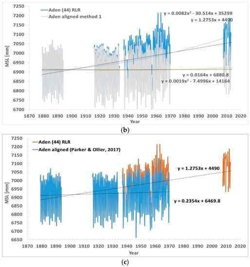 Aden results. (a) Linear fittings applied to the five segments. (b) MSL aligned compared to the PSMSL RLR data. (c) MSL aligned, with the same method, but only three segments, as in [21], with the latest data omitted, compared to the PSMSL RLR data. When measured, the sea levels are rising slowly, or they are decreasing. The rising trend of the PSMSL RLR data is the result of the shifts of one segment versus the other, always upwards versus the values suggested by the alignment of the breakpoints.