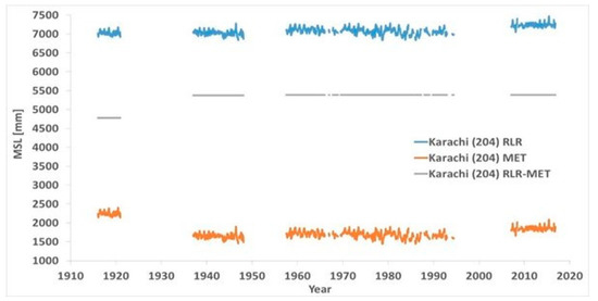 The tide gauge of Karachi was analyzed in [3]. Figure 6 presents the RLR (revised local reference) and MET (metric) data of PSMSL for Karachi (data downloaded from www.psmsl.org/data/obtaining/rlr.monthly.data/204.rlrdata, www.psmsl.org/data/obtaining/met.monthly.data/204.metdata, accessed on 18 May 2018), plus their difference Delta RLR-Met. The different segments are clearly shown from either change in the Delta RLR-Met or significant gaps without measurements.