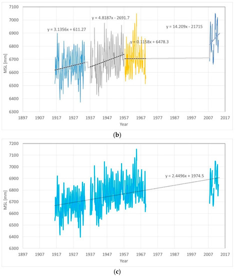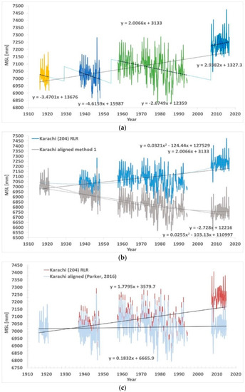 Figure 7a,b presents the latest Karachi results, data from January 1916 to November 2016. Figure 6a shows the linear fittings applied to the four segments. Figure 6b shows the MSL aligned compared to the PSMSL RLR data.