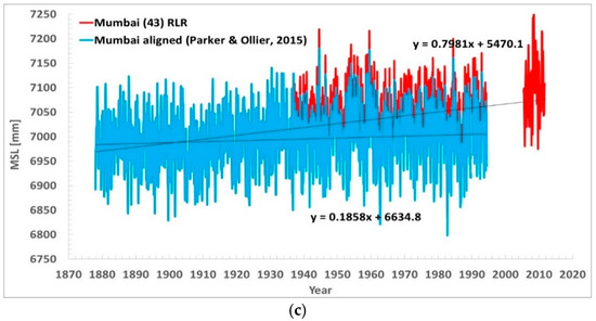 In contrast to [34], other studies [33,35] computed a large sea level rate of rise for Mumbai, of +0.91 mm/yr over the time window 1878–1982. The differences [33,36] were attributed to, “somewhat different changes of mean annual land level (or relative sea level) obtained from the two sets of records to our generally earlier and later records”. Based on the linear fitting of the MSL data, in the latest PSMSL RLR data set, the rate of rise from January 1978 to December 1981 was +0.79 mm/yr. When the data were realigned, it was −0.24 mm/yr. Emery and Aubrey [35] did not include Aden and Karachi in their analysis.
