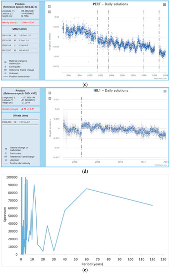 Fremantle. (a) and (b) linear and parabolic fittings of the PSMSL RLR data, as it is or with gaps filled. (c) and (d) subsidence rates of nearby GPS domes. Images reproduced and modified from SONEL, www.sonel.org. (e) Periodogram of the PSMSL RLR data with gaps filled about the parabolic trend.