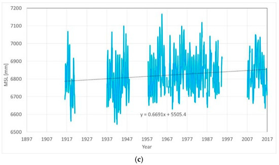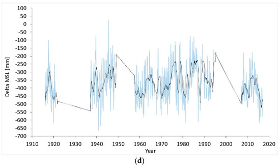 Figure 3 presents the MSL of Aden, Mumbai, and Karachi. The figure also presents the MSL of Fremantle, the other long-term tide gauge of the Indian Ocean. Opposite to Aden, Mumbai, and Karachi, Fremantle is not a segmented record. In the pictures, from sealevel.info (www.sealevel.info), the MSL is claimed to be clear of the regular seasonal fluctuations due to coastal ocean temperatures, salinities, winds, atmospheric pressures, and ocean currents. The clearing process includes quite complicated operations that might be doubted, however marginally affecting the computed trends. Figure 3a,b presents the MSL for Aden, with data from NOAA (tidesandcurrents.noaa.gov/) and from PSMSL. The data from NOAA are simply an earlier version of the PSMSL data. The earlier version still available from NOAA is called (n − 1), and the latest version from PSMSL is called (n). As the databases of climate parameters are unfortunately unstable, it is common to have historical data revised from one version to the other.