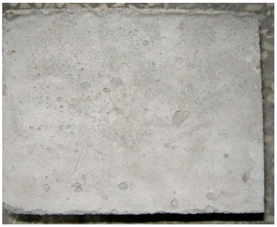 Salt-frost test was conducted in light of the CDF test method recommended by RILEM (International Union of Laboratories and Experts in Construction Materials, Systems and Structures) [12] and concrete specimens were molded in accordance with the designed ratio of mixing. After inserting a PTEF (polytetrafluoroethylene) partition into the sample, molding was performed through vibration. There were five molded specimens with the dimension of 150 × 150 × 150 mm in each group. After curing for 28 d in a standard curing room, the specimens were split into half and the surfaces (Figure 4) formed with the partition were used in the salt-frost test, with the dimension of 150 × 150 mm. After drying the specimen outside, butyl rubber with aluminum foil was used to seal the specimens for 28 d. After that, they were immediately immersed into salt solution of 3% concentration in a test chamber in the depth of 5 mm. Freezing and thawing test was carried out immediately afterwards.