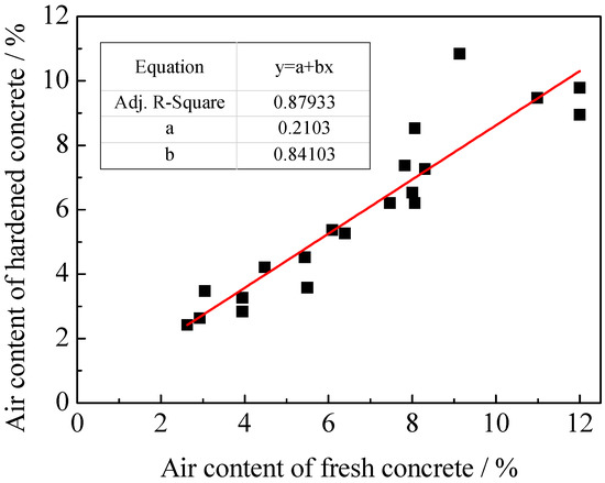 Firstly, the relationship between air contents of fresh concrete and hardened concrete determined by the RapidAir 457 image analyzer was studied and the results are shown in Figure 5. Air content of hardened concrete was linearly correlated with that of fresh concrete [13] and the correlation coefficient reaches 0.88. In addition, the air content of hardened concrete has an average loss of about 16% compared with that of fresh concrete and the maximum loss rate is about 30%.
