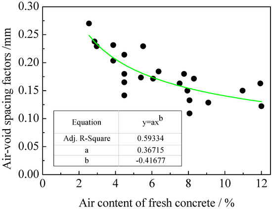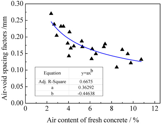 - The air-void spacing factor was closely related to air content. The air-void spacing factor showed a decreasing trend in the form of a power function with the increase of air content, and was more closely correlated with the air content of hardened concrete compared with that of fresh concrete.