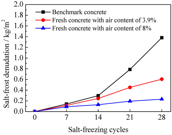 Figure 8 demonstrates the changes of the scaled mass of fresh concrete, with different air contents, with the number of salt-freezing cycles [14]. It can be seen that an increase in the scaled mass of the benchmark concrete specimens, without mixing air entraining agent, accelerates after reaching 14 cycles, and reaches about 1.3 kg/m2 after 28 cycles. It is followed by the increase trend of the scaled mass of the fresh concrete specimens with air content of 3.9%, which reaches about 0.7 kg/m2 after 28 cycles. Moreover, the scaled mass of the fresh concrete specimens with air content of 8% shows a small change trend and is only about 0.2 kg/m2 after 28 cycles.