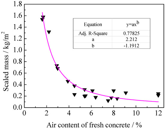 By further analyzing data of the salt-frost scaling of the concrete with different air contents after 28 cycles, as presented in Figure 9, it is found that the scaled mass of the concrete due to salt-frost reduces [15] in the form of a power function with the increase of air content and the correlation coefficient is up to 0.78. When the air content of fresh concrete is higher than 6%, the trend of the scaled mass of the concrete decreasing with the rise of air content gradually slows down.
