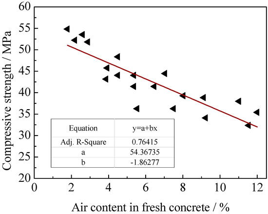 Figure 10 demonstrates the compressive strength of the concrete linearly declined with the growth of air content in the fresh concrete, with the correlation coefficient of 0.76. Moreover, the compressive strength of the concrete reduced by about 4% every time the air content rose by 1%, as shown in Figure 10.