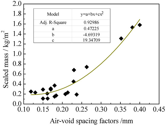 Based on further analysis of the data of the air-void spacing factor of hardened concrete and the scaled mass of the concrete due to salt-frost, as presented in Figure 11, it is found that the air-void factor shows a good relationship with the salt-frost scaling of the concrete [16], and their correlation reaches 0.93. With the constant decrease of the air-void spacing factor, the scaled mass of the concrete specimens due to salt-frost rapidly reduces. When the air-void spacing factor decreases from 0.4 to 0.2 mm, the scaled mass reduces from 1.6 to about 0.3 kg/m2, by about 80%. When the air-void spacing factor is smaller than 0.18 mm, its influence on salt-frost scaling resistance reduces.