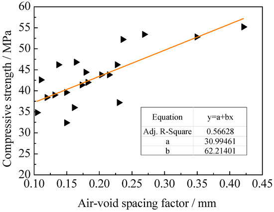 Figure 12 presents the relationship between the compressive strength and the air-void spacing factor. The lower the air-void spacing factor was, the denser the air voids and the lower the compressive strength of concrete, as presented in Figure 9. The correlation coefficient between the air-void spacing factor and the compressive strength of the concrete was 0.57.