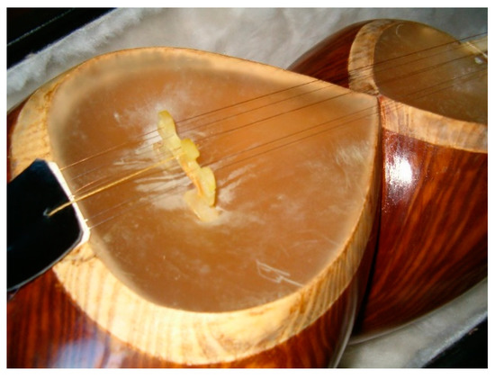 Figure 1) that is commonly played in many countries on the Caucasus region. This musical instrument could be considered to be the most representative Persian musical instrument in view of its characteristic shape and sound. Often this musical instrument is also called a čāhārtār or čārtār, which means “four string” in Farsi. This is a common practice in Persian-speaking areas in which lutes are distinguished on the basis of the number of strings originally employed. Belonging to the lute family, the thar appeared in its present form in the middle of the eighteenth century and has since become one of the most important musical instruments in Iran and the Caucasus. The body is a double-bowl shape carved from mulberry wood, with a thin membrane of stretched lambskin covering the top. The long and narrow neck has a flat fingerboard with twenty-five to twenty-eight adjustable gut frets, and there are three double courses of strings. Its range is about two and one-half octaves (C3-A6), and it is played with a small brass plectrum.