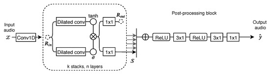 Where and are the filter and gated convolutional kernels, and the hyperbolic tangent and sigmoid functions and ∗ and · the operators for convolution and element-wise multiplication. The residual output connection and the skip conection are obtained via a 1 × 1 convolution applied to z. Thus, is sent to the post-processing block and is added to the current input matrix , thus, resulting in the residual input feature map of the next dilated convolutional layer.