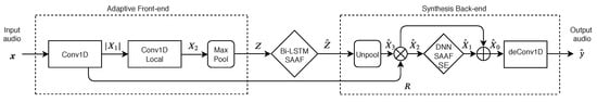 Block diagram of CRAFx; adaptive front-end, latent-space Bi-LSTM and synthesis back-end.