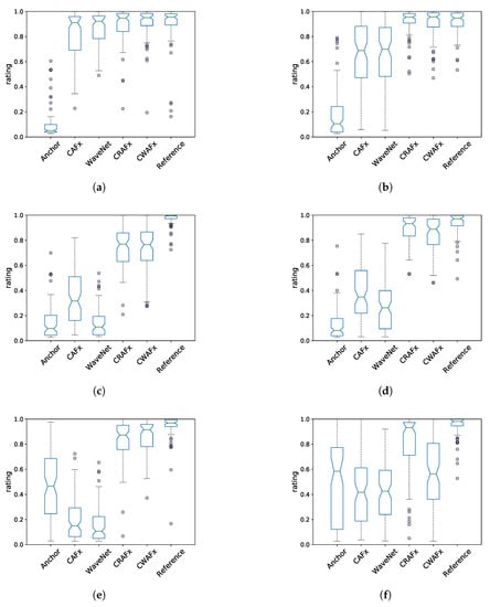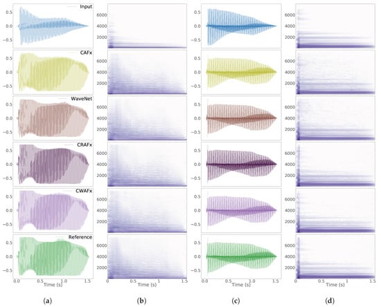 With respect to the horn tremolo and woofer tremolo modeling tasks, it can be seen that for both rotating speakers, CRAFx and CWAFx are rated highly whereas CAFx and WaveNet fail to accomplish these tasks. Thus, the perceptual findings from Figure 6c,d confirm the results obtained with the ms_mse metric and overall, the woofer task has a better matching that the horn task. Nevertheless, for CRAFx and CWAFx, the objective and subjective ratings for the horn tremolo task do not represent a significant decrease of performance and it can be concluded that both time-varying tasks were successfully modeled by these architectures.