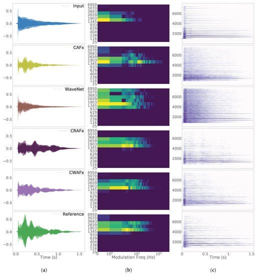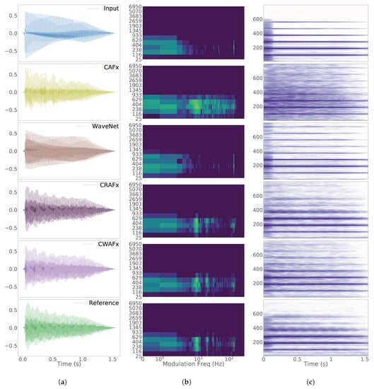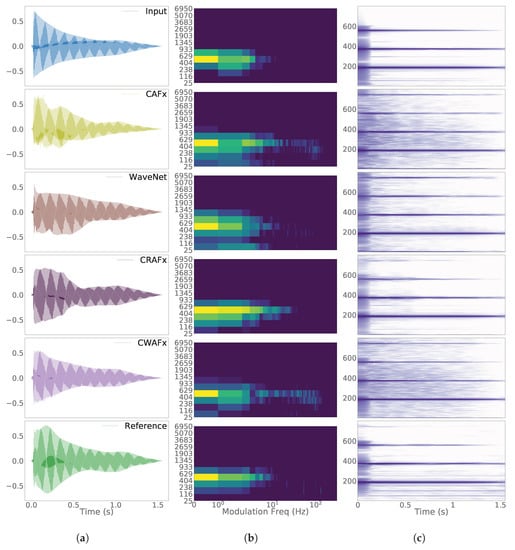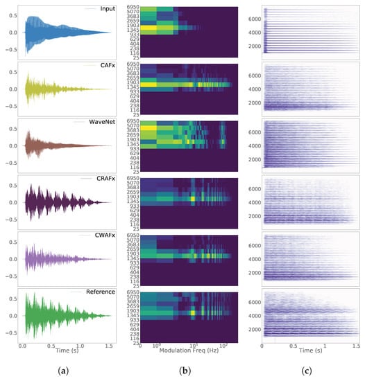 CRAFx is perceptually ranked slightly higher than CWAFx. This indicates a closer matching of the reference amplitude and frequency modulations, which can be seen in the respective modulation spectra and spectrograms from Figure 9 and Figure 10.