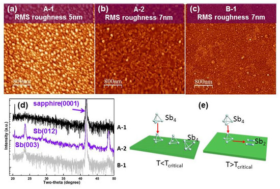 (a–c) Atomic force microscope (AFM) images of sample A-1, A-2, and B-1. (d) X-ray diffraction (XRD) diffractogram of sample A-1, A-2, and B-1. (e) Proposed cracking mechanism of Sb4 on the surface, showing the difference when T < Tcritical and T > Tcritical.