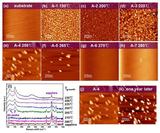 (a–h) AFM images of a c-plane sapphire substrate and sample A-1 to A-7, showing the surface morphology change due to the temperature increment. (i) Raman spectra of all the group A (Sb4) samples. Peaks at 350 cm−1 to 450 cm−1 are from the c-plane sapphire, 110 cm−1 and 150 cm−1 are the two signature vibrational modes of antimony. (j,k) AFM images of antimonene, being characterized immediately after the sample is taken out of the vacuum and one year later.