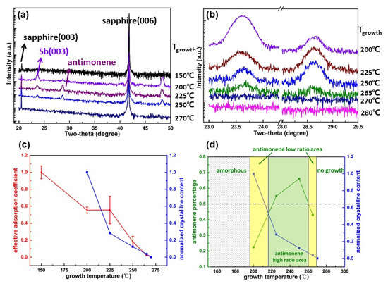 Figure 3a shows the XRD data that were measured from group A samples. It can be seen that, when the growth temperature is between 200 °C–250 °C, the grown antimony has preferentially crystalized signals such as Sb (003) peak at 23.7°and Sb (012) peak at 28.7°. Figure 3b shows the zoomed-in diffractogram in that region. We can calculate the integrated area of each peak and easily obtain the ratio of Sb (012)/Sb (003) as a function of the growth temperature. Since Sb (012) peak is the indicator of antimonene formation, this ratio can be used to find the preferred growth condition for antimonene. We define a term to represent the total crystalline content, which is calculated as the sum of the integrated areas of antimony (003) and (012) peaks, based on Figure 3b. As shown in Figure 3c,d (the blue curves), when growth temperature increases, the total crystalline content on the sapphire surface decreases in the growth window until zero. It is worth mentioning that all of the XRD scans are symmetric scans on the sapphire (0001) so only the crystal planes that are parallel to the surface can be measured. This means the total crystalline content is underestimated and the detected signals indicate the coherence of the crystals that are likely to have been epitaxially grown on the substrate. We also introduce an effective adsorption coefficient to describe the adsorption process of Sb4 molecules on c-plane sapphire, as shown in Figure 3c (the red curve). The effective adsorption coefficient is calculated while using the ratio of the effective thickness at all growth temperatures (Table 1) and the effective thickness of 150 °C. We assume that, under 150 °C, the effective adsorption coefficient is 1, because of the low vapor pressure and high sticking coefficient of Sb at this temperature [36]. Calculation details can be found in the Supplementary Materials.