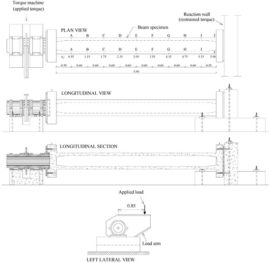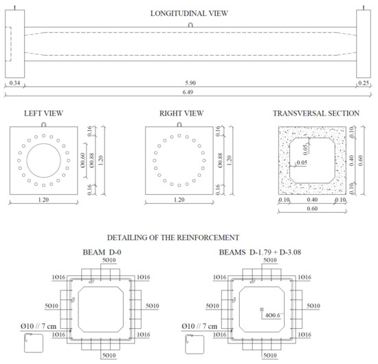 For this study, three hollow beams were tested up to failure. The beams had a squared cross-section and were 5.90 m long. During testing, the beams had an extremity fixed to the strong floor of the laboratory and the load was applied to the other extremity by an electromechanical actuator. In this extremity, a special device transformed the linear point load applied by the actuator into a torque applied to the beam extremity. The dimensions of the test models are presented in Figure 2. The geometry and dimensions of the adopted cross-section are in line with some of the works previously referred and leading with hollow beams.