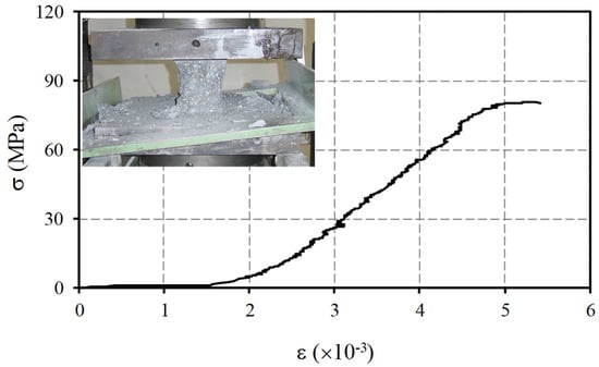 As example, Figure 3 illustrates a stress ()–strain () curve recorded during the test of one of the concrete samples. The initial part of the graph shows the influence of the adjustment due to the existent gap between the loading plates of the test machine and the concrete specimen.
