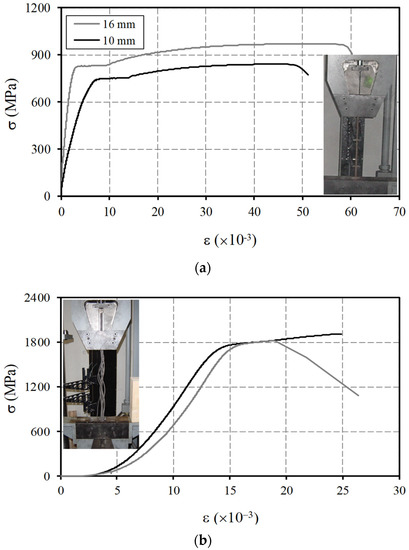It should be referred that some slip was observed between the steel specimens and the claws of the test machine. This explains the apparent different initial stiffness between the curves for 10 and 16 mm bars in Figure 4a and also the initial part of the curves in Figure 4b. This problem had no implication to the previously presented strain values at the end of the elastic stage. The strains were computed from Hooke’s law by knowing the stresses and assuming the Young’s Modulus.