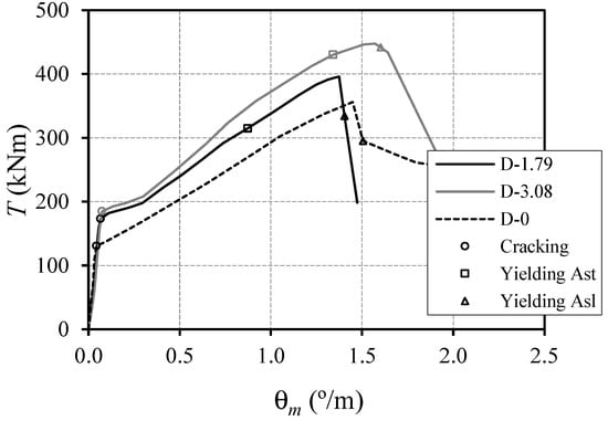 Table 3 presents, for each tested beam, the main properties of curves, namely—the cracking torque and correspondent twist ( and ), the torsional stiffness in State I (), the torsional stiffness in State II (), the torque corresponding to the yielding of the transverse reinforcement and correspondent twist ( and ), the resistant torque (peak torque) and correspondent twist ( and ). Since the yielding of the longitudinal reinforcement occurs after the peak torque, the corresponding values are not presented.