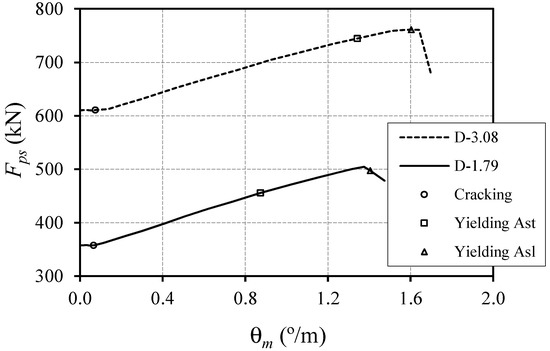 curves of Figure 8 also show that, before the peak torque is reached, the prestressed beams only present points corresponding to yielding of the transverse reinforcement. It is observed that the yielding of longitudinal reinforcement only occurs after the peak torque. After cracking, the longitudinal prestress reinforcement starts working as ordinary reinforcement under the torsional loading. Consequently, the beams with balanced longitudinal to transverse reinforcement ratios will lose this balance because of the influence of the prestress wires. Hence, the calculation of the balanced ratio of the longitudinal to transverse reinforcements should account for the area of the prestressed steel ( with ), which leads to an excess of longitudinal reinforcement of about . Therefore, the transverse reinforcement should yield before the longitudinal reinforcement, as observed in Figure 8.
