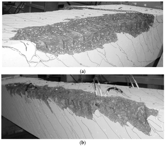 Figure 10 and Figure 11 show some photographic records of the failure zone of the tested beams. From these photos and from the analysis of the graphs at their final part it is possible to distinguish two failure modes.