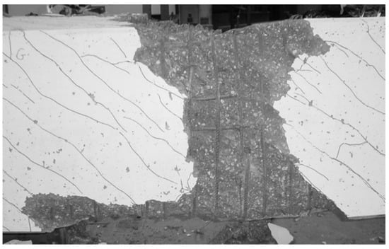 With a low level of prestress (1.79 MPa), Beam D-1.79 had the same failure mode as Beam D-0 (with no prestress), characterized by concrete break off at the corners (Figure 10). It should be mentioned that this particular fragile failure mode, somehow frequent in hollow beams, was observed and reported in previous studies [6,10]. For a moderate prestress level (3.08 MPa), Beam D-3.08 clearly shows a fragile failure by crushing of concrete in the struts due to compression. This failure mode was particularly destructive and explosive (Figure 11). These results seem to show that the prestress level influences the failure mode. The results seem to indicate that, as the initial prestress increases, the failure becomes more fragile. This reveals an unfavourable effect of the prestress, which is observed for moderate levels of prestress.