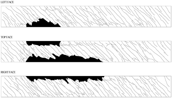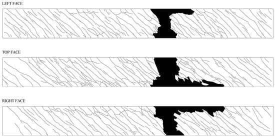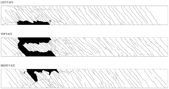 To analyse the cracking pattern of the tested beams, photographs were taken and posterior graphic tools were used to produce graphic type images for the three visible faces (lateral faces and top face) for all the beams. Such illustrations are presented in Figure 12, Figure 13 and Figure 14.