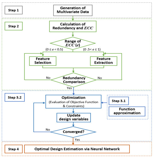 Proposed optimum design framework with the dimension reduction (DR). ECC, entropy-based correlation coefficient.
