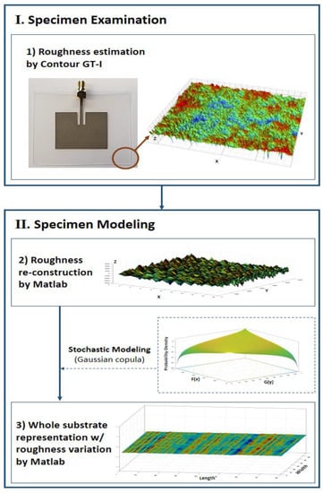 To model the substrate thickness fluctuation, a stochastic representation of a random field was taken into account. For this purpose, a Gaussian copula was employed to generate the random behavior corresponding to the thickness variation. Figure 5 demonstrates how the copula builds a joint distribution including two distinct sampling sets of thickness variation. First, the roughness of the substrate made of PDMS material was measured by Contour GT-I 3D Optical Microscope. The measured roughness data were added onto the mean thickness of the substrate, which is 0.9705 mm, to describe the variation of the thickness of the whole substrate. In this process, the Gaussian copula generated the random thickness samples engaging several marginal distributions of each sampling set of the thickness variation. Thus, the antenna can be modeled with the substrate, containing 202 small parts that have random different thicknesses and the patch with a thickness of 0.03 mm. Specifically, 500 FEAs were performed with different displacements generated within the range from 0 mm to 12 mm. For each of these simulations, 202 inter-correlated random thickness values were created from the Gaussian copula.