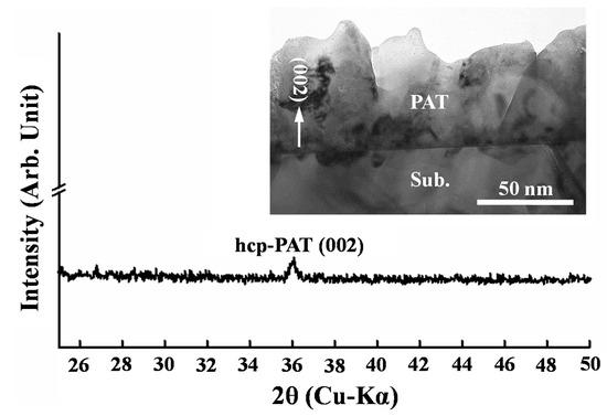 The crystalline structure of the PAT thin film was analyzed by a grazing-angle x-ray diffractometry (GAXRD, Rigaku 2200, Japan). Moreover, the interface microstructure was also identified by a high-resolution transmission electron microscope (TEM; JEOL-2100, Japan). The focused ion beam system was applied to prepare an electron transparency area of the cross-sectional TEM sample.